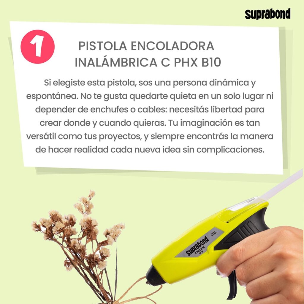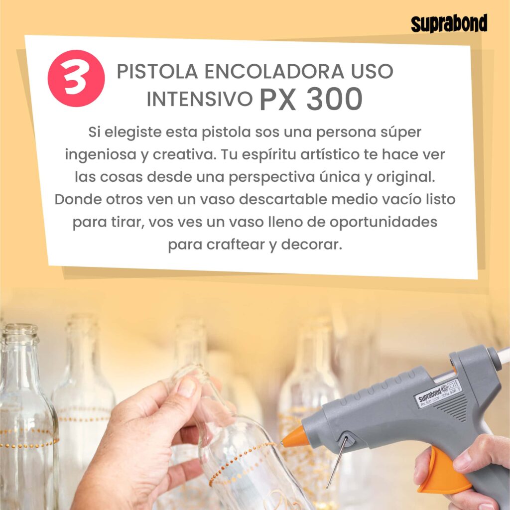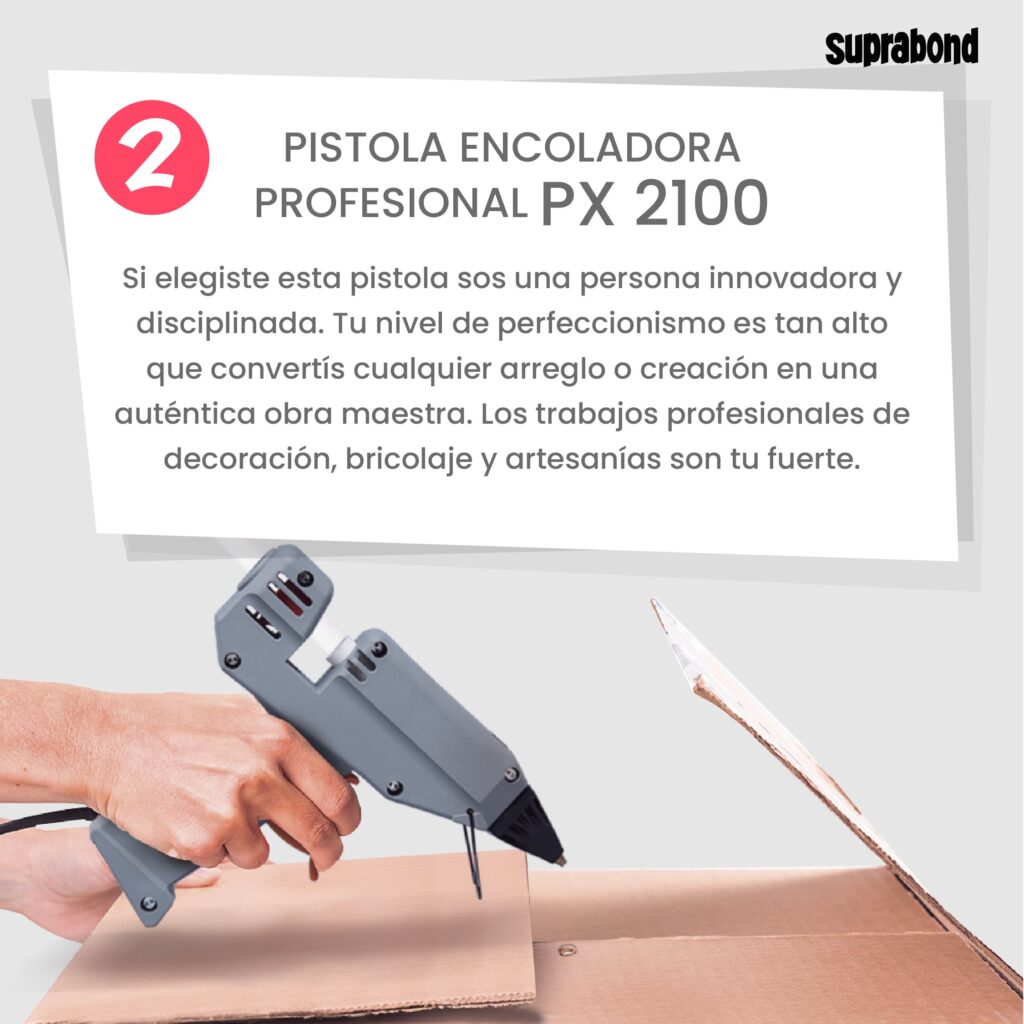 Suprabond es una empresa argentina con más de 70 años de trayectoria en la fabricación de adhesivos y soluciones para el hogar. Contamos con una gran experiencia en la categoría de Pistolas Encoladoras las cuales están certificadas bajo normas IEC 60335-1 y 60335-2 garantizando en cada uno de sus modelos la seguridad para el usuario.