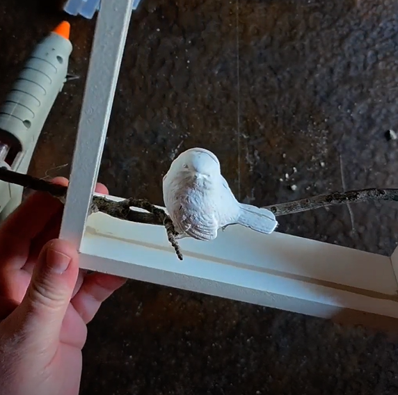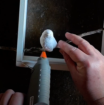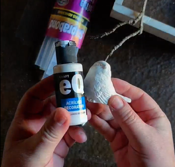 2.- Pintamos el pajarito con acrílico blanco y lo adherimos con la misma pistola.