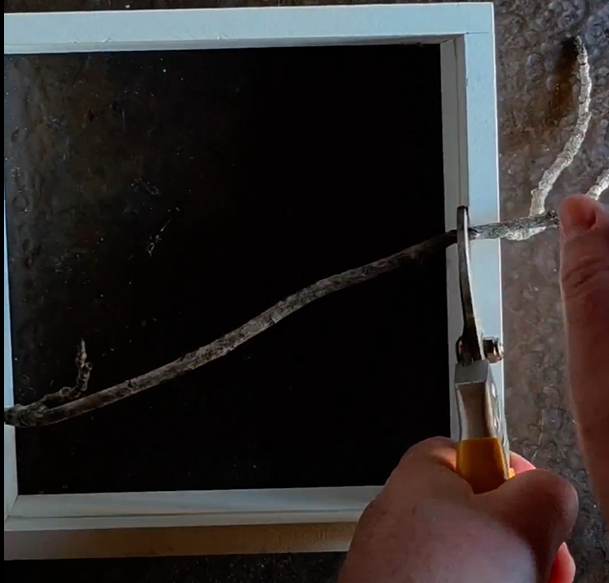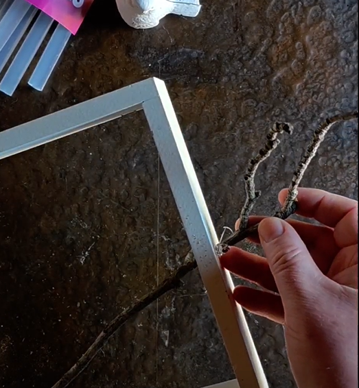 3.- Vamos a reciclar un marco en desuso con una rama de un árbol que encontramos en la calle. La idea es lograr un efecto que la rama supere los límites del marco, que entre y salga de él. Nos fijamos dónde queremos poner la rama y la presentamos. Una vez que encontramos el lugar, tomamos la medida del marco, y la cortamos con una pinza.