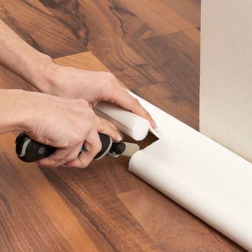 Con la ayuda de un cutter, cortar el zócalo del mismo tamaño que la puerta.