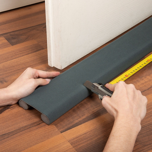 Deslizar el zócalo por debajo de la hoja de la puerta con la parte descubierta de los rollos hacia abajo, de manera que quede uno de los rollos a cada lado de la puerta.