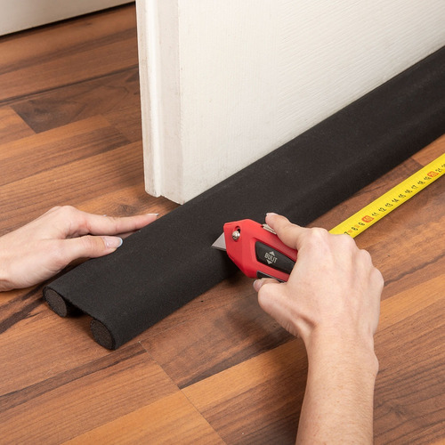 Deslizar el zócalo por debajo de la hoja de la puerta con la parte descubierta de los rollos hacia abajo, de manera que quede uno de los rollos a cada lado de la puerta.