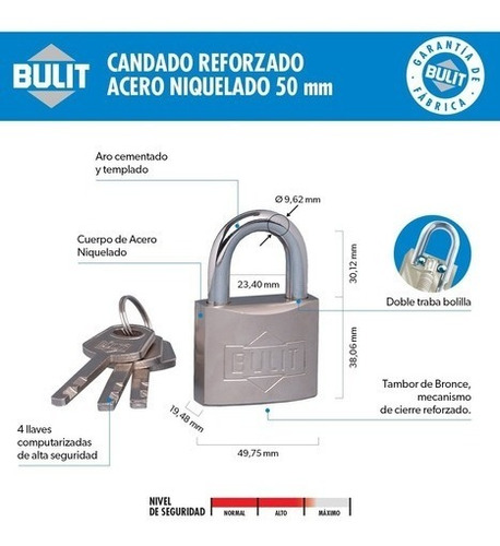 Candados con mecanismo de cierre reforzado y cuerpo de acero niquelado.