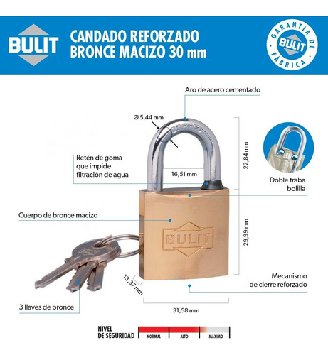 Candado reforzado de bronce doble traba – 30 mm – 3 llaves