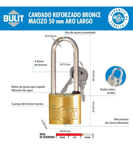 Candado reforzado de bronce doble traba y aro largo – 50 mm – 3 llaves