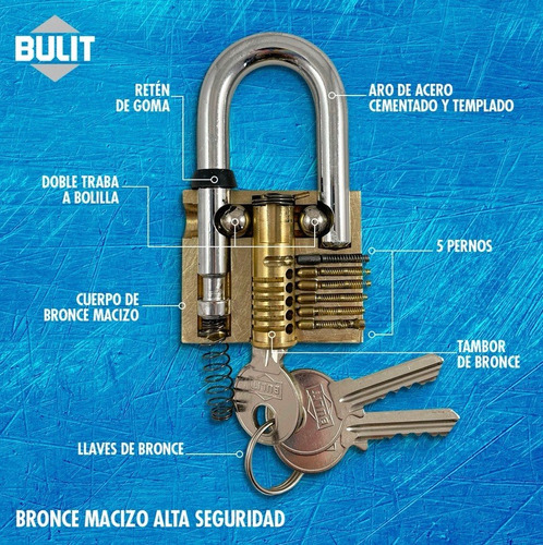Candados con cuerpo de bronce macizo y mecanismo de seguridad que impide retirar la llave con el candado abierto (Mecanismo de cierre reforzado).