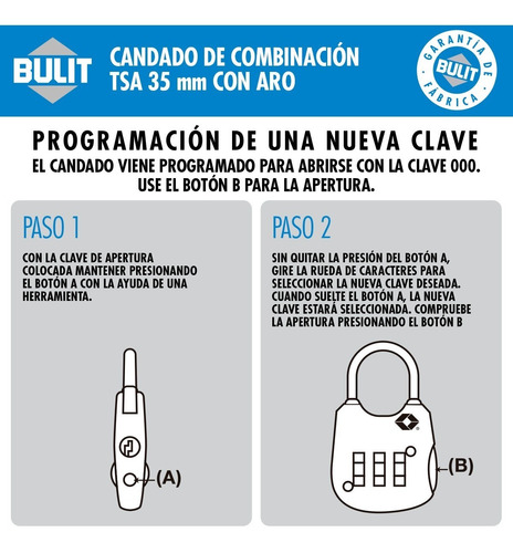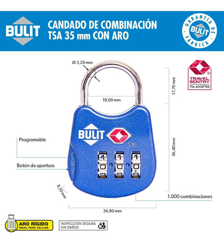 Los Candados TSA BULIT están aprobados y homologados por la Agencia de Seguridad en el Transporte (TSA) de Estados Unidos. Permite a las autoridades de seguridad aeroportuaria abrir e inspeccionar el equipaje con una llave maestra sin dañarlo.