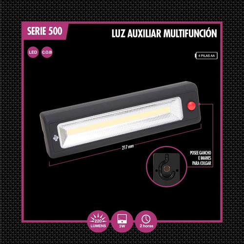 Características: Tecnología LED C.O.B Posee gancho e imanes para colgar Largo de la Linterna 217 mm 220 Lumens 2 horas 4 pilas AA