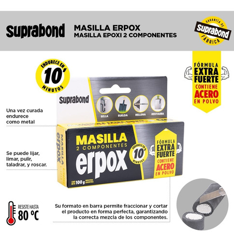 Suprabond Masilla Erpox está especialmente formulada con partículas de acero en polvo que permiten realizar trabajos de alta exigencia. Una vez curada endurece como metal, pudiéndola perforar, roscar, lijar, limar y pintar.