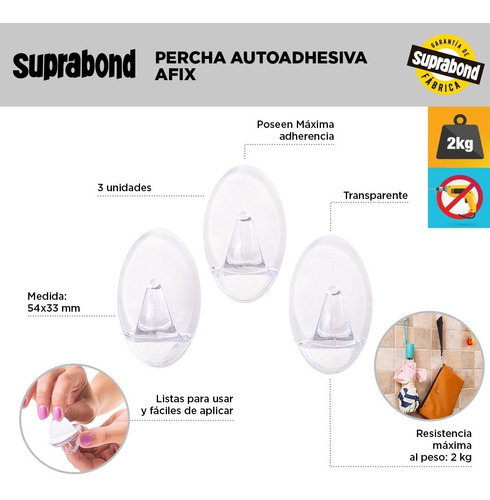 Suprabond Perchas Autoadhesivas Afix poseen máxima adherencia, son prácticas y útiles para gran variedad de usos en el hogar. Ideales para colgar abrigos, toallas, carteras, etc.
