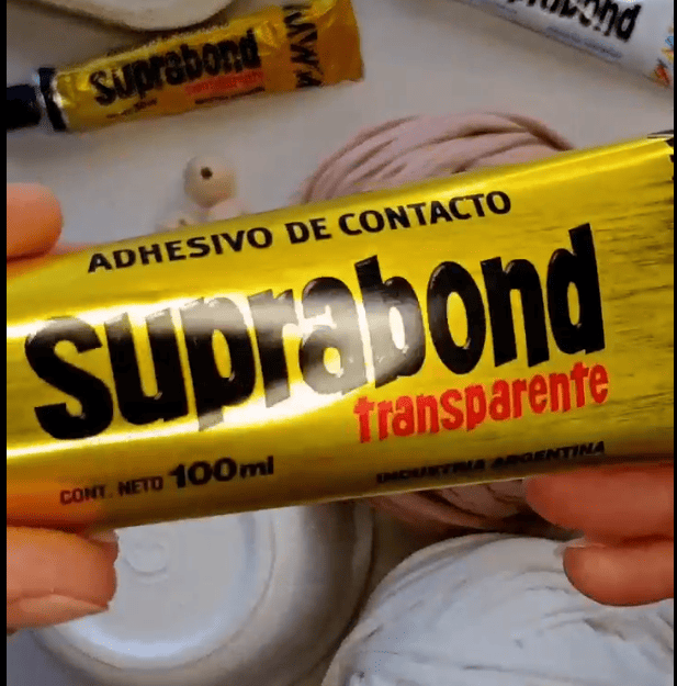 TIP: Al poner el adhesivo Suprabond Transparente Extra Fuerte, hay que dejarlo orear unos minutos para que la totora se pegue mejor.