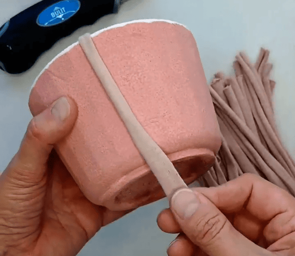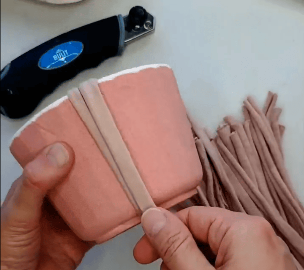 2.- Una vez que la pintura está seca, vas a tomar la medida del alto del contenedor, para poder pegar la totora, dejándole un extra arriba, y un extra abajo.