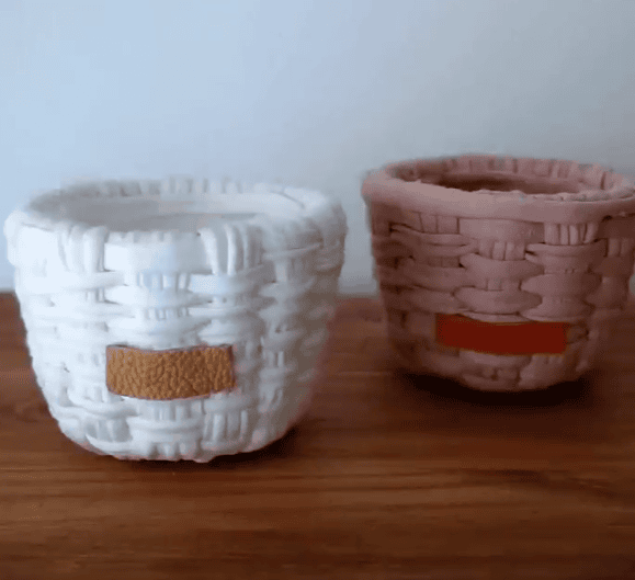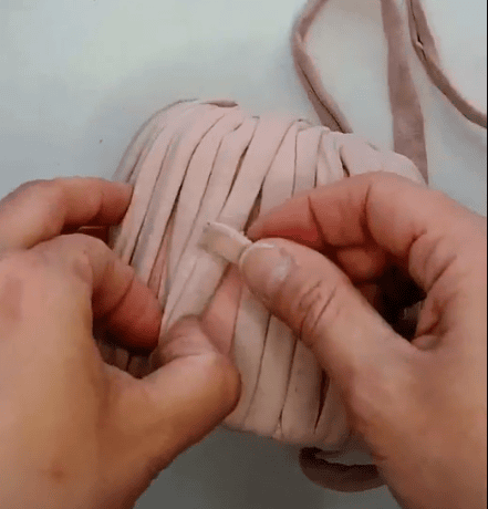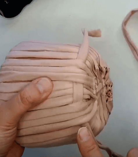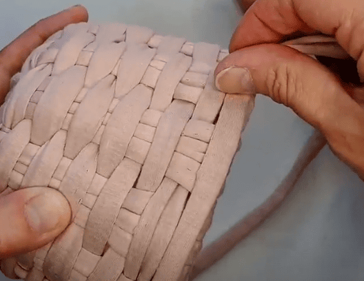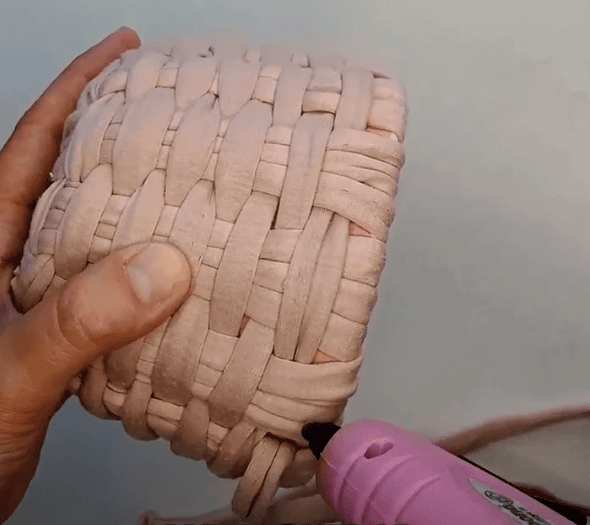 4.- Ahora hay que ir “tejiendo” la totora en el sentido opuesto al anterior. Vamos a ir pasando 3 líneas por arriba, 3 líneas por abajo, y así ir armando un hermoso tejido en toda la circunferencia del contenedor.