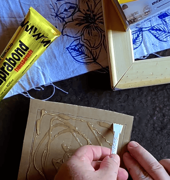 4.- Cortamos un cartón con la medida del bastidor, le ponemos un poco de Suprabond transparente Extra Fuerte, “pintándolo” con la espátula que viene en el pack; y pegamos la tela con el diseño realizado.
